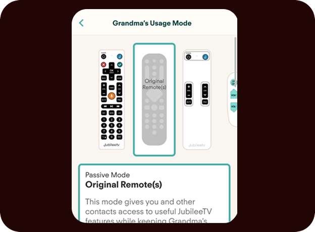 For seniors with dementia, the best remote is one that removes complexity. JubileeTV offers an optional 6-button remote designed specifically for this need—just Power, Volume, and Channel Up/Down. It works with their existing cable or satellite box and can be paired with features like channel favorites and Passive Mode to further simplify the experience.