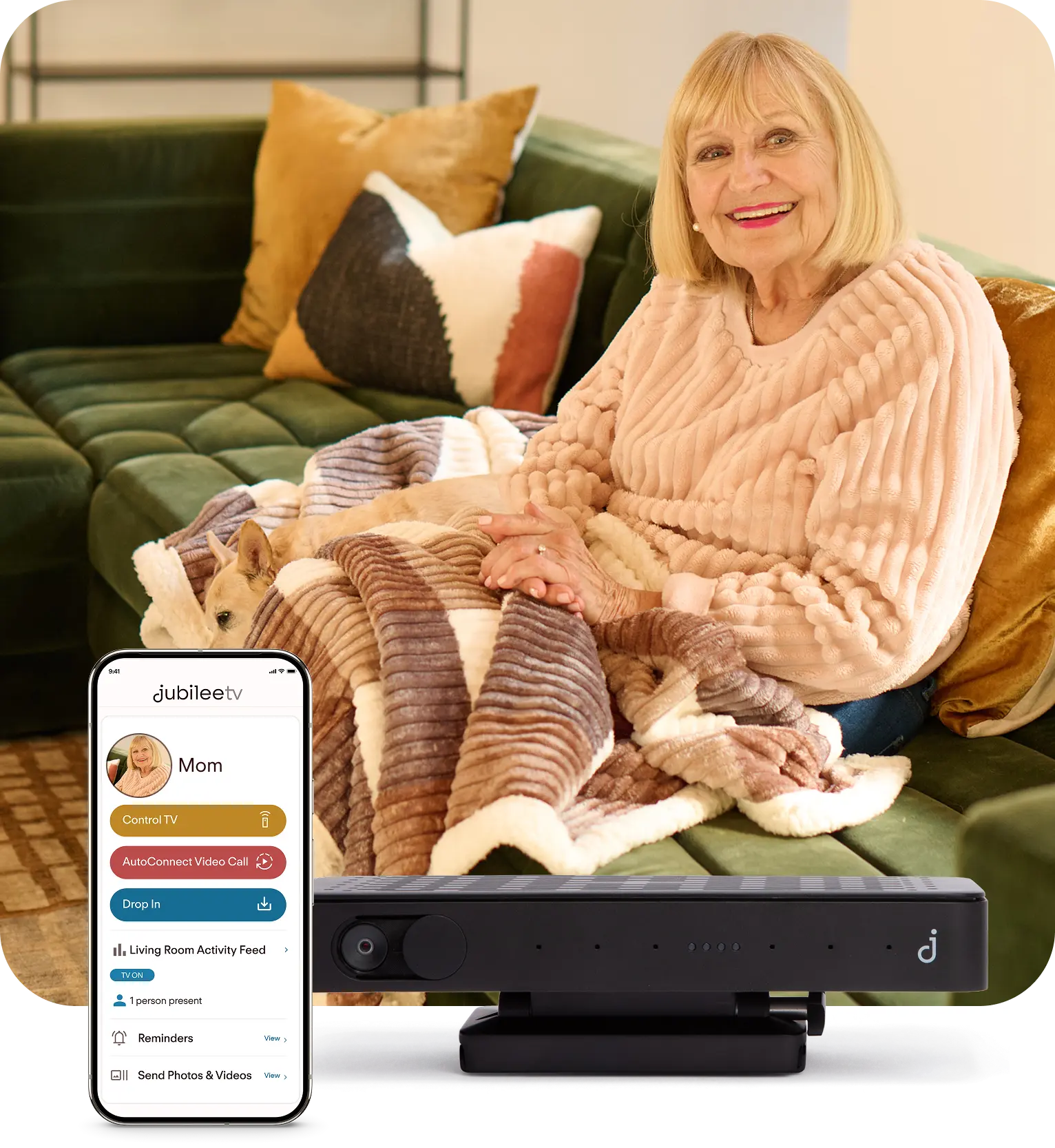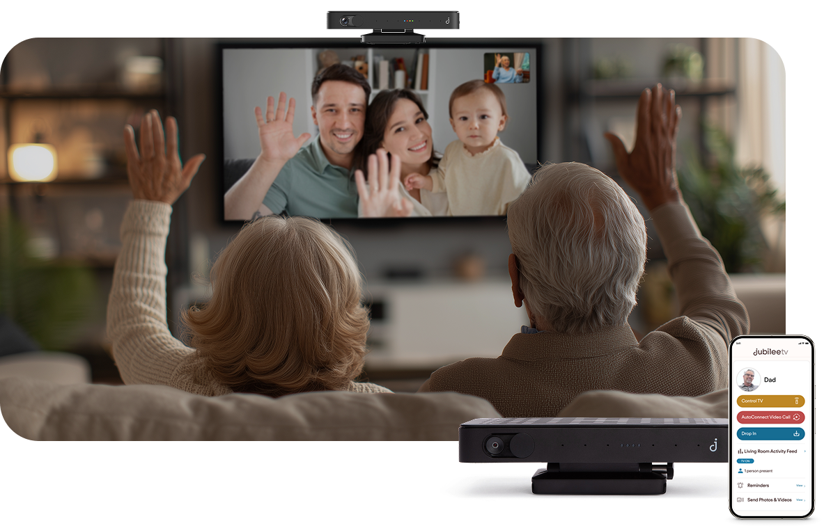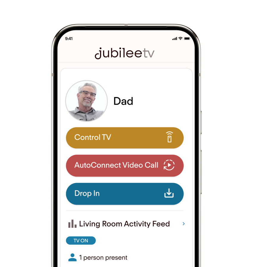 JubileeTV helps families navigate dementia with dignity. Control their TV from your phone. Monitor daily routines. Start video calls. All while keeping their experience simple and staying close through every stage.